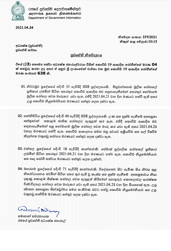 කොවිඩ් -19 වෛරසය ආසාදනය වී පුද්ගලයින් සිව් දෙනෙක් මියගොස් ඇති බව සෞඛ්ය සේවා අධ්යක්ෂ ජනරාල්වරයා ඊයේ (23) දිනයේ තහවුරු කර තිබේ.