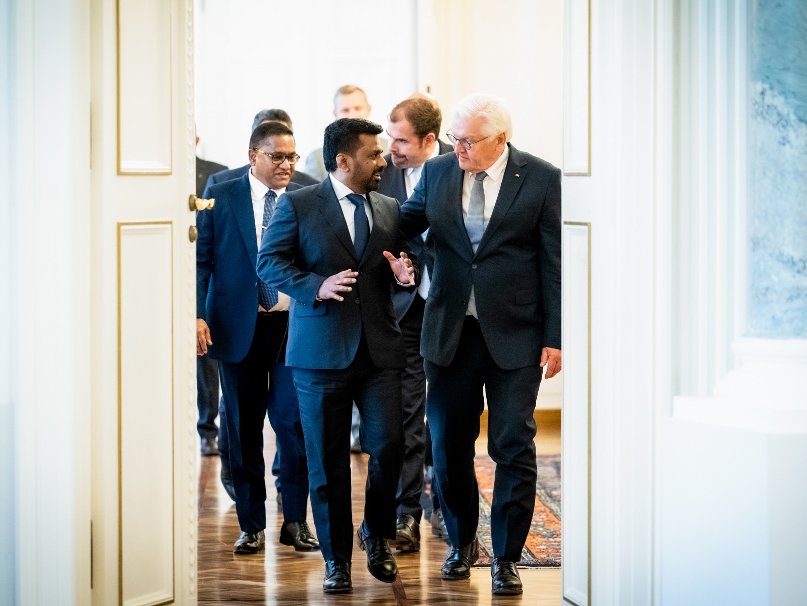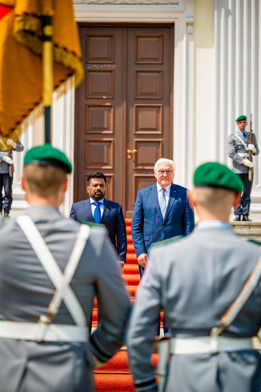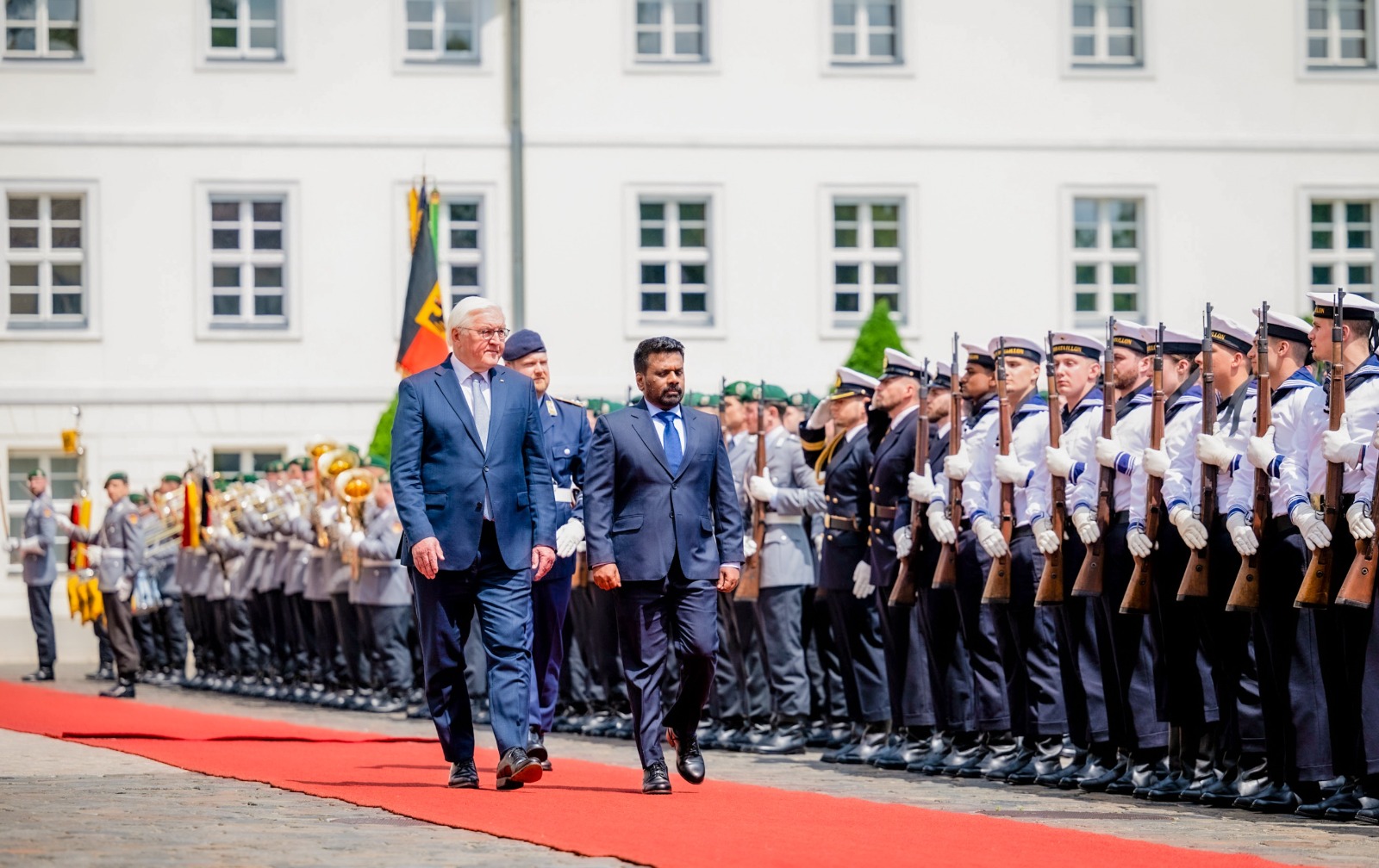 ජනපති ජර්මානු ජනාධිපති හමුවෙයිබර්ලිනයේ බෙල්වීව් මන්දිරයේදී රාජ්ය ගෞරව සහිතව පිළිගැනේජර්මානු ෆෙඩරල් ජනරජයේ නිල සංචාරයක නිරත ජනාධිපති අනුර කුමාර දිසානායක මහතා ජර්මානු ජනාධිපති ෆ්රෑන්ක්-වෝල්ටර් ස්ටයින්මියර්ගේ (Frank-Walter Steinmeier) මහතා විසින් අද (11) උණුසුම් අයුරින් පිළිගනු ලැබීය.බර්ලිනයේ බෙල්වීව් මන්දිරය (Bellevue Palace) වෙත පැමිණි ජනාධිපති අනුර කුමාර දිසානායක මහතා ජර්මානු ත්රිවිධ හමුදා උත්තමාචාර සහිතව පිළිගනු ලැබූ අතර, ජනාධිපතිවරයා ත්රිවිධ හමුදා පෙළපාලිය නිරීක්ෂණය සඳහා එක්විය.නිල පිළිගැනීමේ උත්සවයෙන් අනතුරුව ජනාධිපති අනුර කුමාර දිසානායක මහතා සහ ජර්මානු ජනාධිපති ෆ්රෑන්ක්-වෝල්ටර් ස්ටයින්මියර්ගේ (Frank-Walter Steinmeier) මහතා අතර ද්වීපාර්ශ්වික සාකච්ඡා පැවැත්විණි. එහිදී දෙරට අතර ආර්ථික හා ජාත්යන්තර සබඳතා තවදුරටත් ශක්තිමත් කිරීම පිළිබඳව දීර්ඝ වශයෙන් සාකච්ඡා කෙරුණ අතර, වෘත්තීය පුහුණු සහ සංචාරක කර්මාන්තය යන ක්ෂේත්රයන්හි සහයෝගීතාව වර්ධනය කෙරෙහි විශේෂ අවධානය යොමු විය.