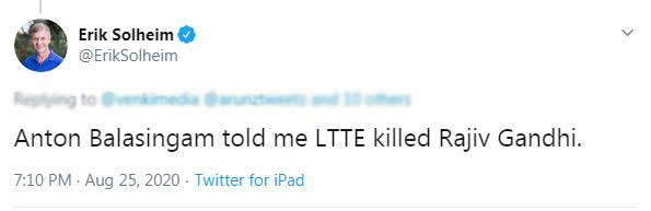 ඉන්දියාවේ හිටපු අග්රාමාත්ය රජීව් ගාන්ධි ඝාතනය කිරීම සඳහා නියෝගකර ඇත්තේ එල්.ටී.ටී.ඊ නායක වේලුපිල්ලේ ප්රභාකරන් බව එවක ශ්රී ලංකාවේ සාම නියෝජිතයෙකු ලෙස කටයුතු කළ එරික් සෝල්හයිම් මහතා පවසයි.